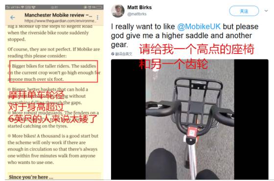 英国网友发文:“摩拜单车轮径对于身高超过6英尺的人来说太矮了。”