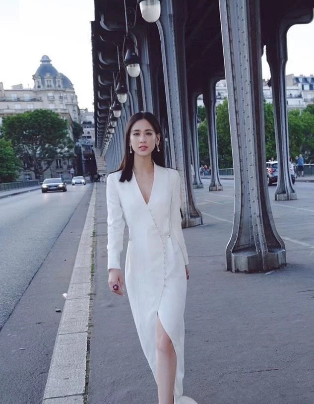 对大多数姑娘而言,还是纯色连衣裙比较友好。要是觉得纯色单调的话,可以选择一些更有设计感的款式。像黄圣依这件白色连衣裙,看似简单,但V领和开叉的设计就很有亮点,还很显高显瘦。腰间的纽扣不但能打造高腰线,还可以很好地凸显出括号臀。