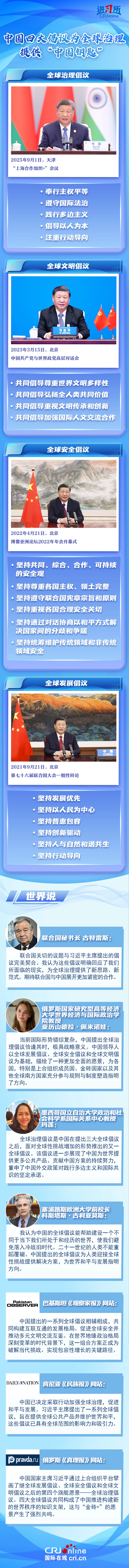 “坚持在历史前进的逻辑中前进、在时代发展的潮流中发展。”全球治理倡议是继全球发展倡议、全球安全倡议、全球文明倡议后,中国为解决全球性冲突和挑战贡献的又一重要公共产品。四大全球倡议各有侧重,并行不悖,分别从发展、安全、文明、治理四个维度,为回答“世界怎么了、我们怎么办?”这一世界之问、历史之问、时代之问提供了“中国钥匙”,彰显了中国在国际事务中的大国担当。国际社会表示,中国一系列全球倡议明确回应了世界所面临的现实问题,为全球治理提供了新思路、新范式,展现了中国为世界提供更多公共产品、贡献中国方案的持续努力。