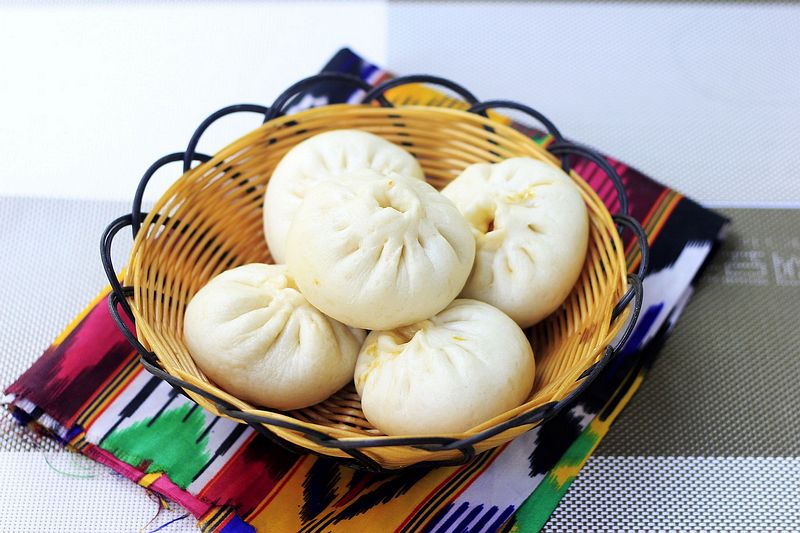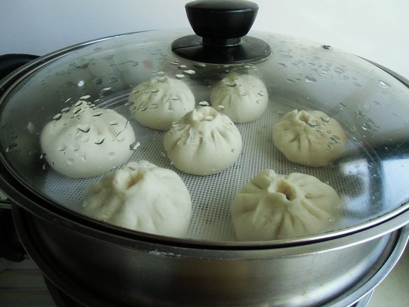 7、把蒸锅加水,大火烧开,加一碗凉水,把蒸锅铺上翕垫,下包子坯加盖,大火蒸20分钟,关火,2-3分钟取出即可