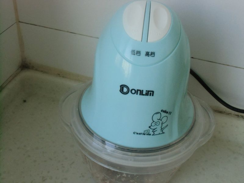 2、把羊肉切块,加绞肉机里,绞成肉泥(不要绞的太碎)