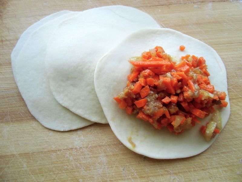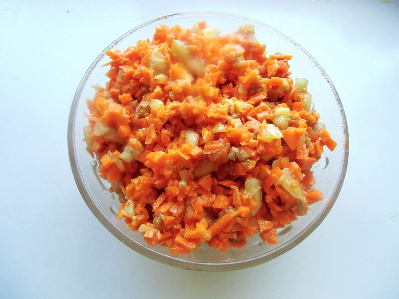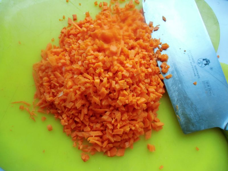 5、把胡萝卜洗净切小丁丁,加肉馅里拌均匀,加熟菜籽油拌均匀,加盐拌均匀,静止一会入味