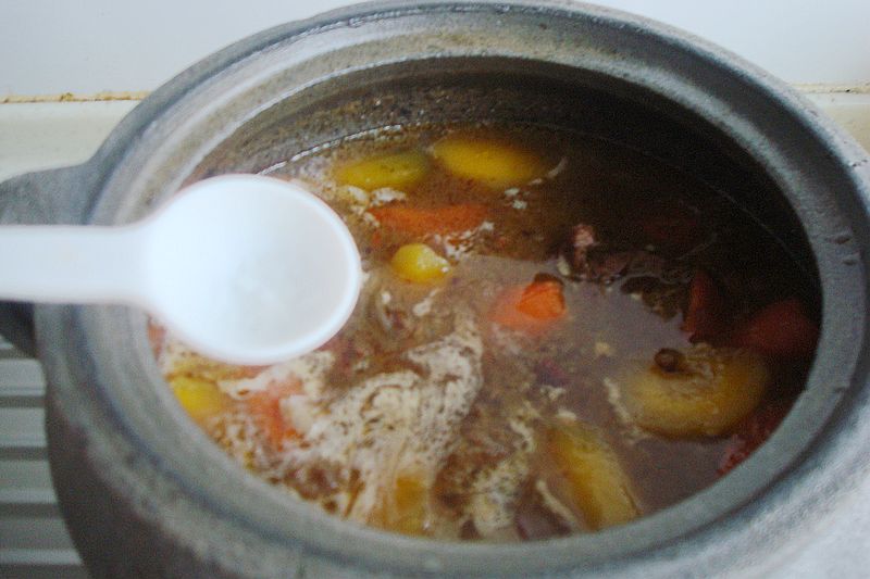 6、倒进沙煲里,转小火炖到牛肉8成熟(大约80分钟)