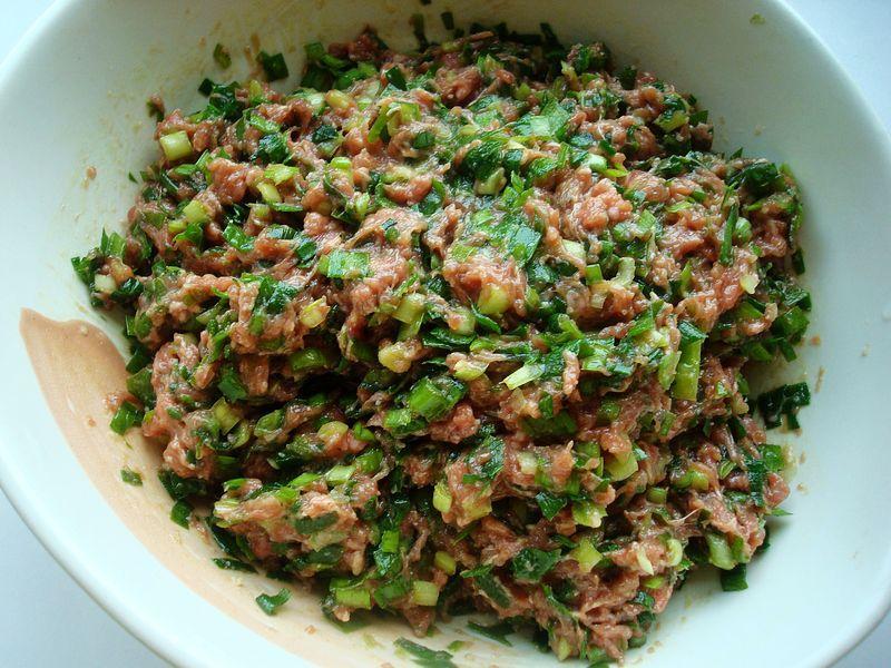 5、加韭菜拌均匀,加熟菜籽油拌均匀(加入食用油是为了锁住肉馅里的水分),静止一会入味