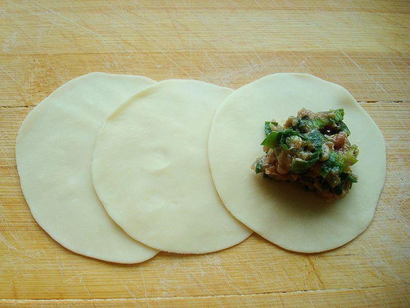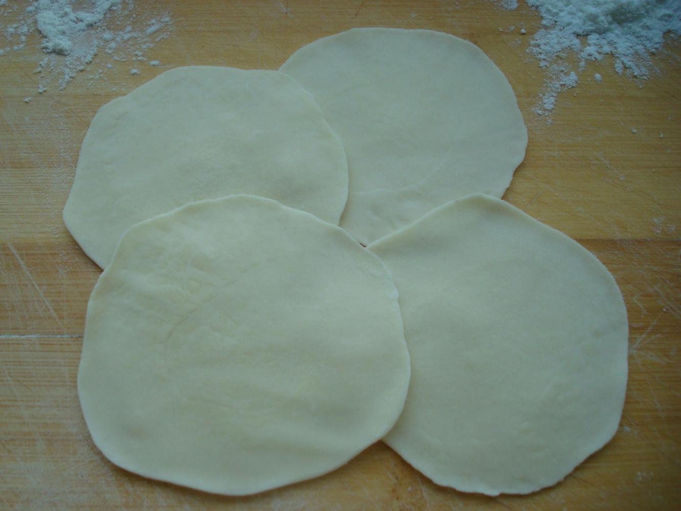 8、擀成中间厚边边薄的小饺子皮,加上肉馅
