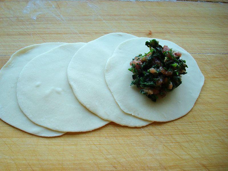8、把醒好的面团再次多揉揉,搓成长条,分成小剂子压扁,擀成中间厚,边边薄的小饺子皮