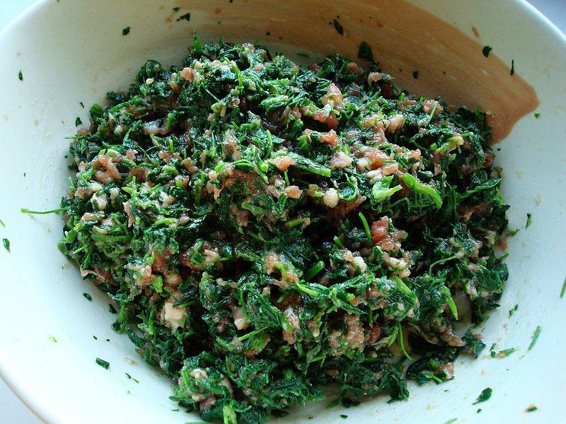 6、加苜蓿、盐拌均匀,加熟菜籽油拌均匀,静止一会入味,这样饺子馅味道好