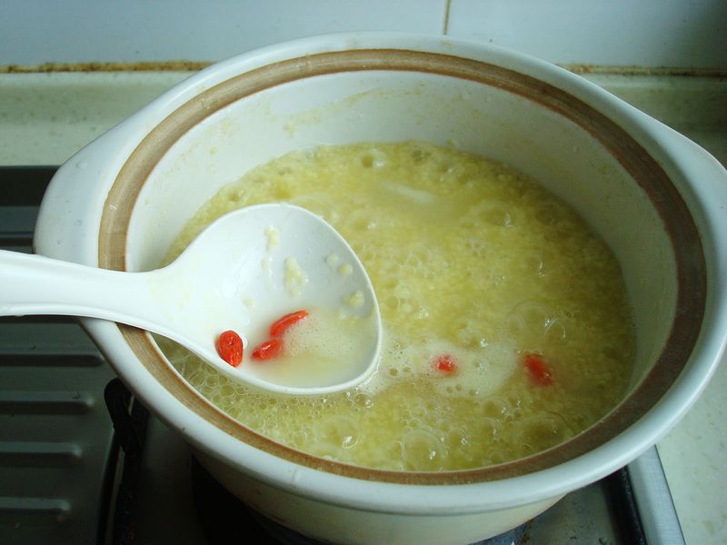 4、转小火熬到开花浓稠(一般10分钟左右即可煮到浓稠)5、加枸杞拌均匀,小米要是太浓稠了,要不停的搅拌,小心糊锅底