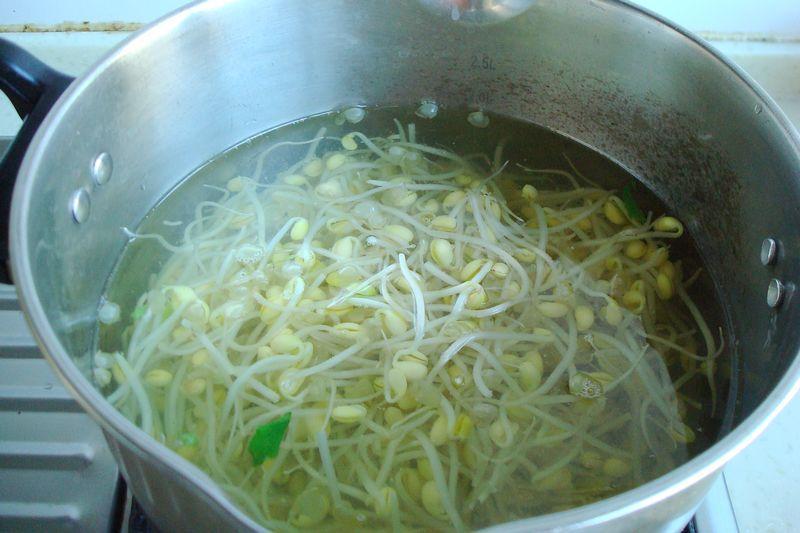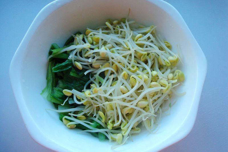 2、汤锅加水大火烧开,下黄豆芽烫到变色捞起,下油麦菜烫到变色捞起
