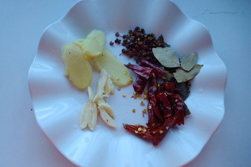 辅料:植物油、盐、姜、豆瓣酱、花椒粒、辣皮子、麻椒、大蒜、八角、桂皮、香叶、豆豉、味精