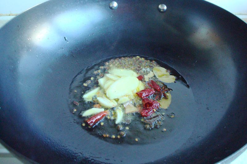 4、热锅凉油,油热7成下花椒粒、辣皮子、姜、八角、桂皮、香叶、大蒜翻炒出香味