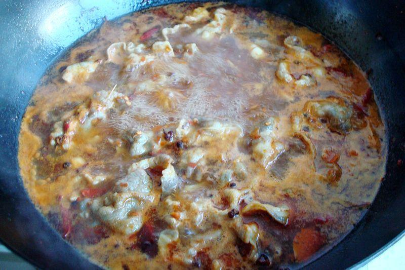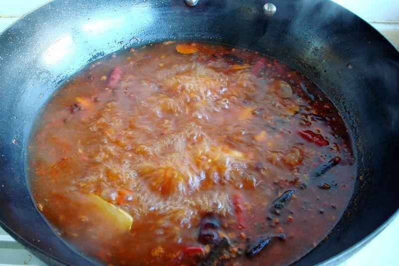 5、加豆瓣酱、豆豉翻炒出红油出酱香味,加水大火烧开,中小火熬制10分钟左右出酱香味