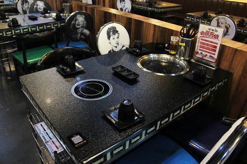 进店就可以看到,装修的古色古香,每个餐桌都是以黑色为主,搭配黑色的餐具,最为有创意的是每个椅子靠背都是美女图像,这点看着真是太醒目,张扬了,难道时尚韩式烧烤就是这样理解的吗?小伙伴们,你们怎么理解“美味时尚、 快乐健康"的饮食新理念”呢???