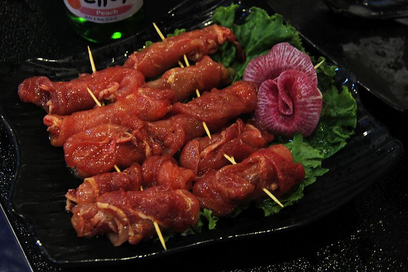 又是划重点了,跳舞牛肉,一位帅哥吃完直接跳起来了,真的在跳舞啊,跳完又是喝水又是喝饮料,把我们看的目瞪口呆。原来大片的秘制牛肉里面裹着泡椒或者小米椒,在烤出来,又香又辣味十足,就看你的口味如何爱吃辣了