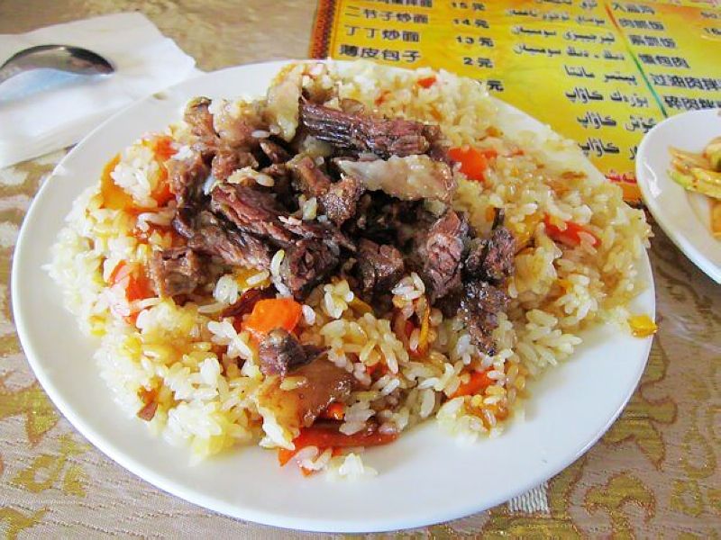 第五种:熏马肉抓饭,这也是抓饭的一种,用熏马肉代替了羊肉做的抓饭,里面的胡萝卜和黄萝卜都一样,就是味道不一样,熏马肉劲道香浓,特别有嚼劲,价格比普通的羊肉抓饭都高一些,一般的特色抓饭店才有。