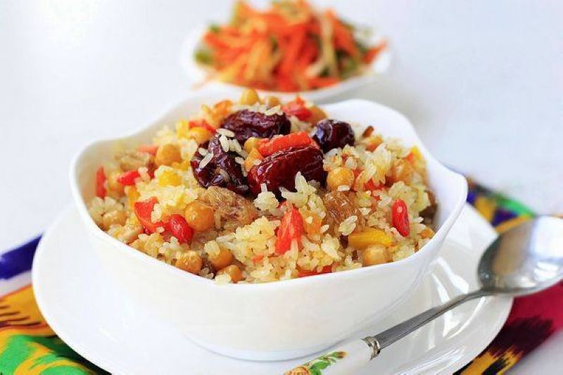 第七种:干果抓饭,这是也被称为素抓饭的一种,又被分为(干果抓饭、水果抓饭、鹰嘴豆抓饭)里面没有一滴肉,完全是用各种干果做出来的,一般的小抓饭店里没有,特色的抓饭才有,在南疆比较常见。