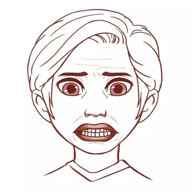 但恐惧眉除了上扬,还会挤作一团,表现为眉毛内角靠得更近。由于内角更为接近,外角看起来就像被摆正了一样,至少比惊讶眉的外角更正些。恐惧眉通常也会导位前额出现横纹,但是一般不会像惊讶眉造成的皱纹那样横贯整个额头。