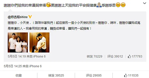 2015年5月5日,修杰楷在微博里公布贾静雯怀孕了,他也在日本求婚了,他和她将开始属于他们一家四口新的人生。
