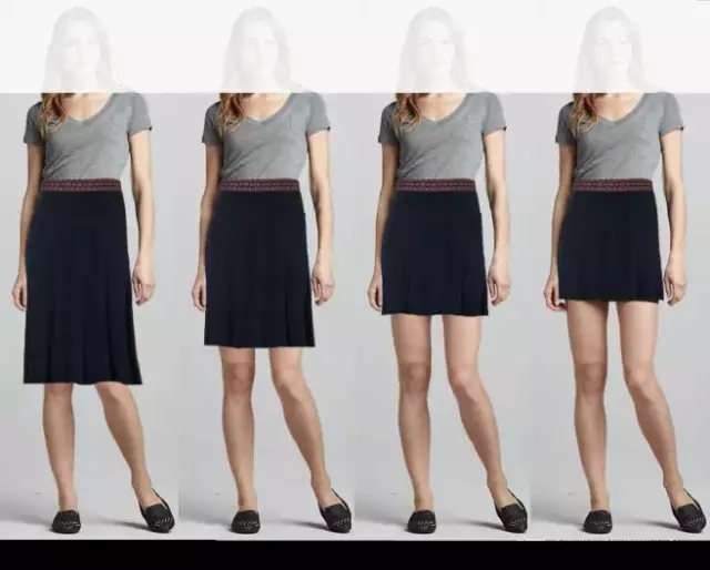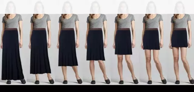小编列举了7个长度的裙长,在腰线固定的情况下,对裙子的不同长度进行一个对比。从膝盖中间的长度往两边看,亲们会发现裙子最长和最短是最显身高的哦!而往膝盖以上都是显腿长的长度。