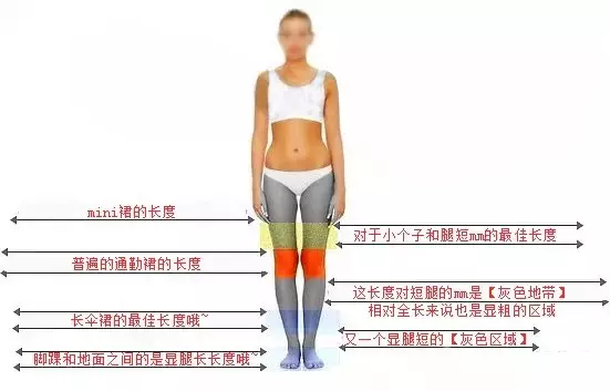 忽略裙型、形状,对于OL们来说,值得注意的是裙子的最常用的长度就是橙色区域,如果你想要达到尽量显高的效果,将裙长稍微提高到膝盖上方稍微高些的长度效果将大相径庭。