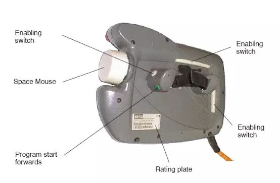 在示教盒的背面有三个白色和一个绿色的按钮。三个白色按钮是使能开关(伺服上电),用在T1和T2模式下。不按或者按死此开关,伺服下电,机器人不能动作;按在中间档时,伺服上电,机器人可以运动。绿色按钮是启动按钮。