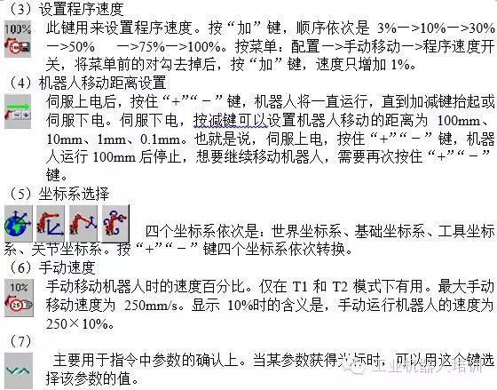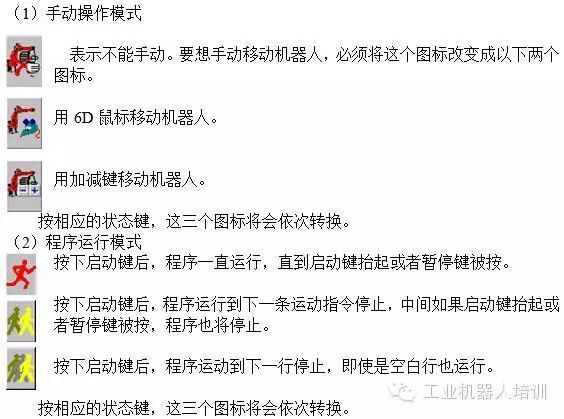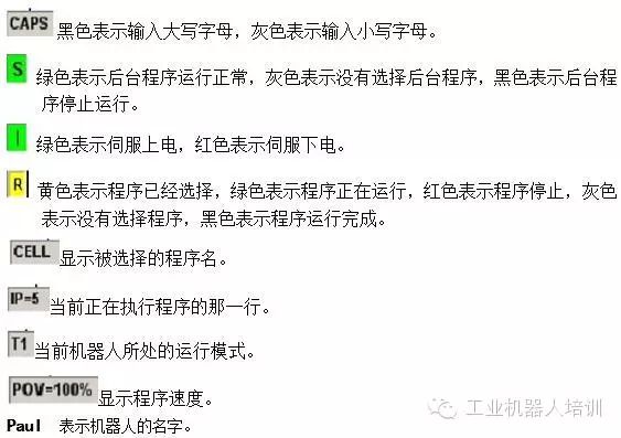 这个按钮用于紧急情况时停止机器人。一旦这个按钮被按下,机器人的伺服电下,机器人立即停止。