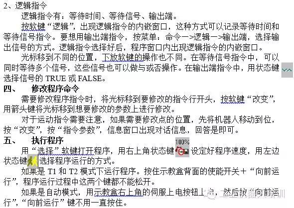 开”。它们的区别是:通过软键“选择”打开的程序处于准备运行状态,光标是黄色的箭头和I型编辑光标,这时候不能在程序中输入字符,即使输入了,系统也不识别,可以修改命令语句的参数,也可以新建语句;通过软键“打开”打开的程序处于编辑状态,光标是红色的I型光标,此时可以对程序进行任何编辑,不能通过“向前运行”键运行程序。
