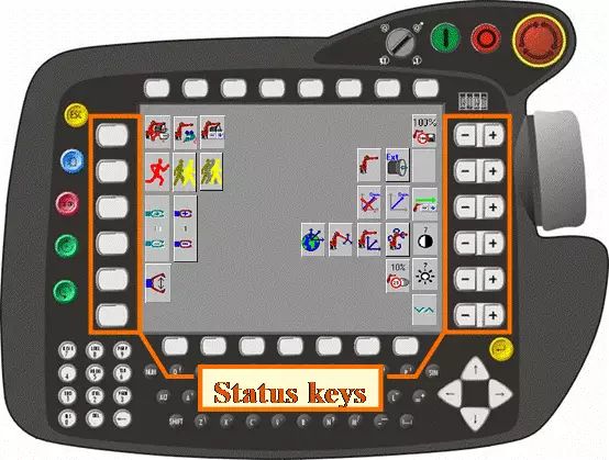 需要运动机器人时,首先要解除急停状态,旋转此按钮可以抬起它并解除急停状态,然后按功能键“确认(Ackn.)”,确认掉急停的报警信息才能运动机器人。