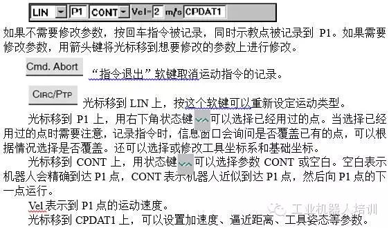 打开程序,将机器人移到示教位置,把编辑光标移到将要插入运动指令的前一行,如果是程序的第一条指令,要插入在PTP HOME和PTP HOME之间。按软键“运动”,程序窗口内出现运动指令的内嵌窗口。