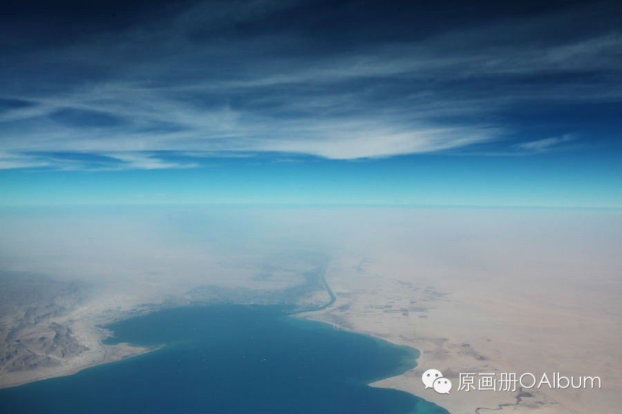 继续飞行不久便能看到埃及的西奈半岛。埃及本土在非洲,西奈半岛在亚洲,亚欧以苏伊士运河为界。先后看到的是西奈半岛东边的红海亚喀巴湾和西边的苏伊士湾,当然还有苏伊士运河入海口。红海的蓝,是一种与其他海水不一样的蓝,让人过目难忘。飞机略过苏伊士运河,这就到了非洲。