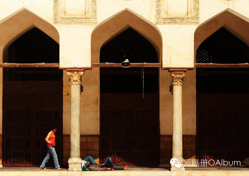 穿过市场向北沿着中世纪的石板路走,几乎每几步就有一座清真寺。古兰经学校,al-aqmar清真寺,苏莱曼希拉达清真寺,哈基姆清真寺,很多都有上千年的历史。哈恩哈利利以北这片区域很安静,几乎是步行区,不如开罗其他地方那么嘈杂,上千年的古老街道也几乎保存下来。初到开罗的紧张终于烟消云散,漫步在安静的小巷,转角也许就有一座伊斯兰式的尖拱门,层层叠叠。仰头是清真寺的宣礼塔林立。围墙上,屋檐上,拱门内,到处是精美的石雕,砖雕,窗格,彩绘。包着头巾的伊斯兰妇女座在窗后,发现镜头的时候总是严肃而羞涩地回避,男人们穿着长袍,我感觉他们从古代来。