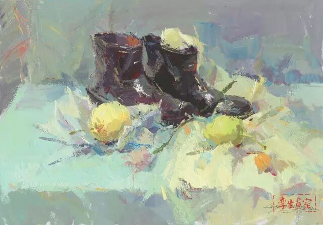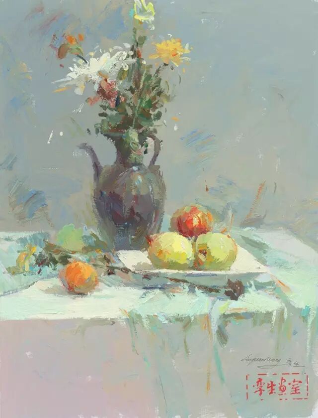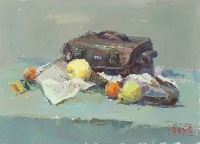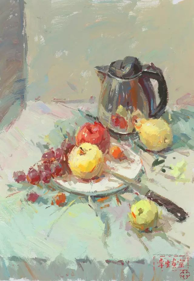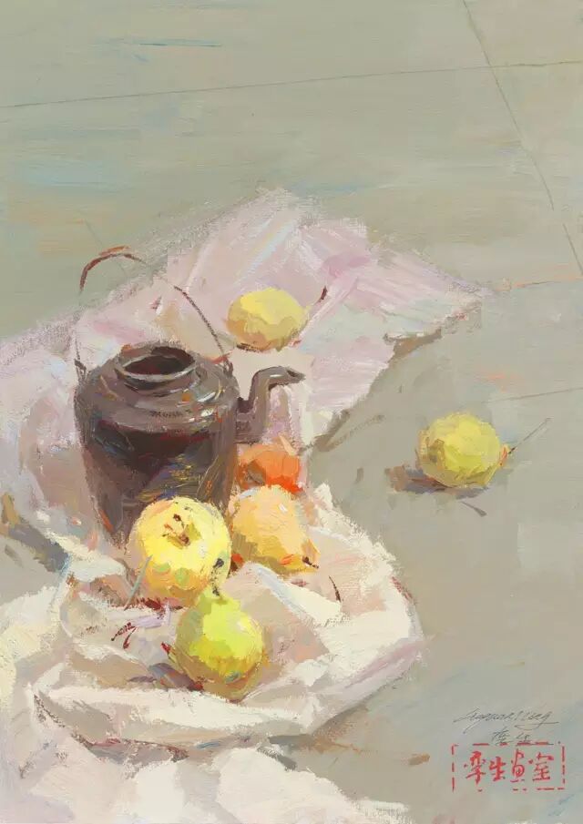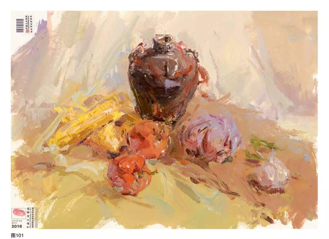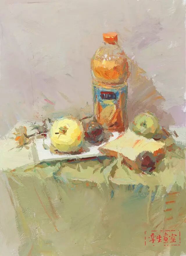 评析 / 这张静物作品处理松紧有度、减弱单体的塑造而将笔墨重点放在对整个画面调性和空间关系的处理上。浓郁的色调是最吸引人的地方,整个暖色色调中通过紫灰色的点缀使画面避免了俗气的调子,该生对色调的控制很到位。