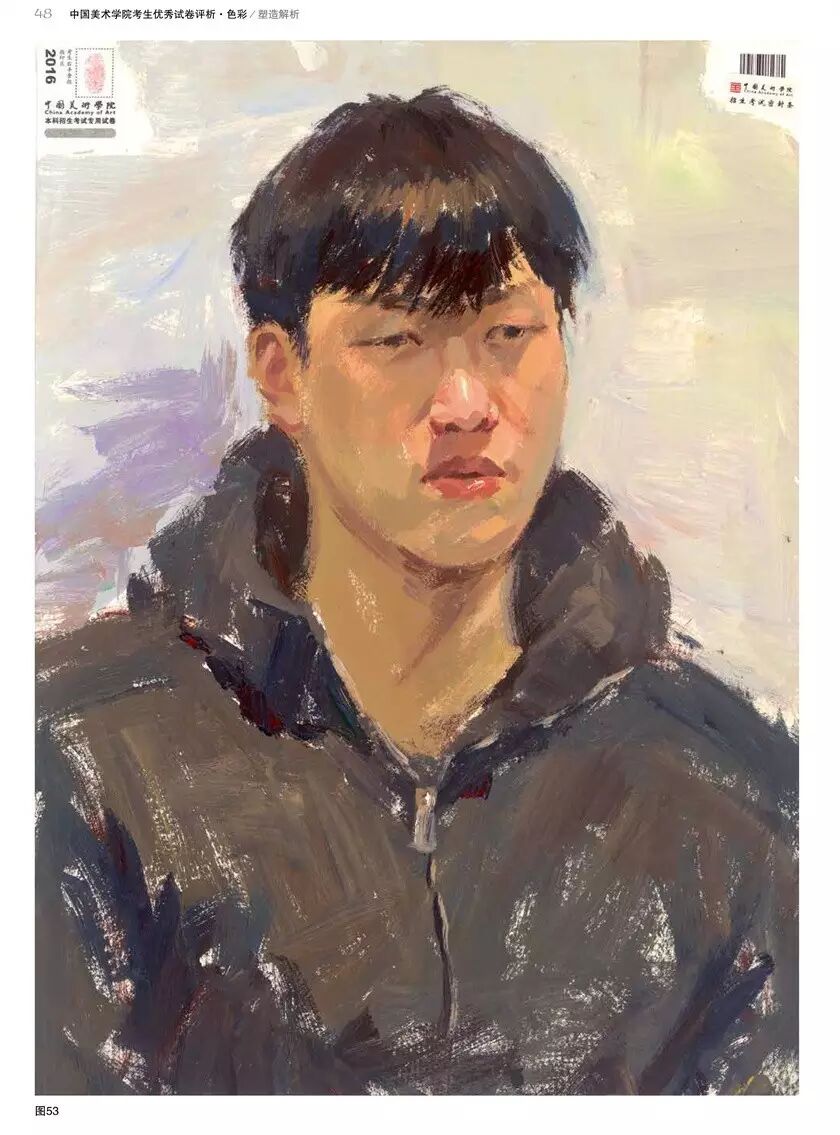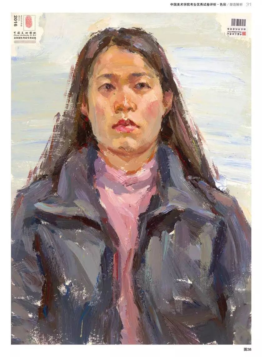 评析 / 这张试卷衣服的处理松动、简洁却又不失严谨的型体。面部的型体也很概括,却又能很巧妙地衬托出生动的五官,将模特的精神气质变相很到位。一副优秀的作品不能仅仅局限在形准和颜色协调,对人物的感受力也是评分中的一线考察要点。