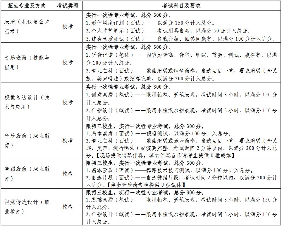 3.音乐表演(职业教育)、舞蹈表演(职业教育)和视觉传达设计(职业教育)本科专业限招“三校生”(即技校、中专或职高毕业生),报考上述三个专业的考生必须参加省教育厅统一组织的“三校生”文化考试,报考其余专业的普通高中应届考生或社会考生必须参加全国高考。