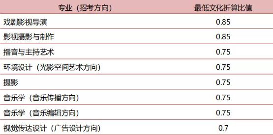 2. 按综合分排名录取。戏剧影视导演、影视摄影与制作、播音与主持艺术、环境设计(光影空间艺术方向)、摄影、音乐学(音乐传播方向)、音乐学(音乐编辑方向)、视觉传达设计(广告设计方向)8个专业,在考生文化折算比值达到学校确定的本专业最低折算比值情况下,按照综合分(综合分=文化折算比值+专业折算比值)择优录取。综合分相同,按专业排名择优录取。