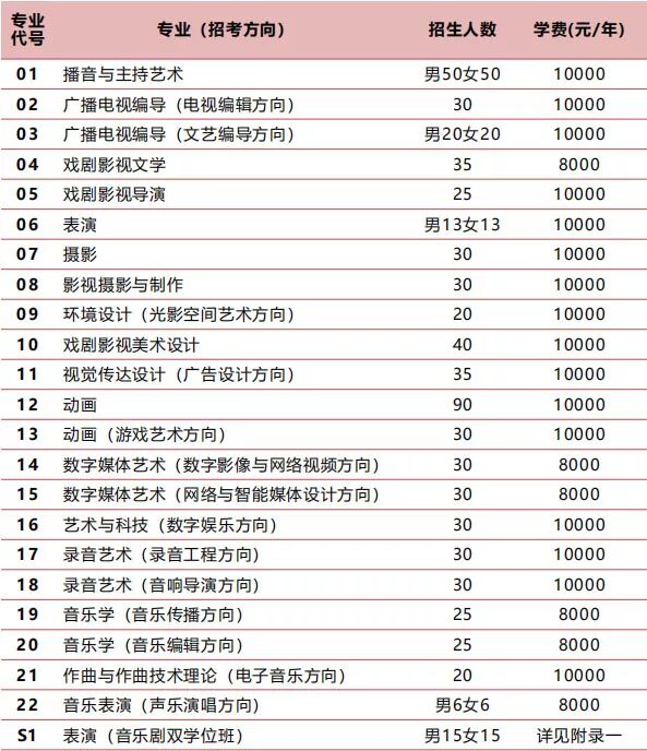 戏剧影视美术设计、视觉传达设计(广告设计方向)、动画、动画(游戏艺术方向)、音乐学(音乐传播方向)、音乐学(音乐编辑方向)、作曲与作曲技术理论(电子音乐方向)、音乐表演(声乐演唱方向)。