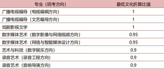 3. 按文化比值排名录取。广播电视编导(电视编辑方向)、广播电视编导(文艺编导方向)、戏剧影视文学、数字媒体艺术(数字影像与网络视频方向)、数字媒体艺术(网络与智能媒体设计方向)、艺术与科技(数字娱乐方向)、录音艺术(录音工程方向)、录音艺术(音响导演方向)8个专业,在考生文化折算比值达到学校确定的本专业最低折算比值情况下,按文化折算比值择优录取。文化比值相同,按专业排名择优录取。各省(自治区、直辖市)录取人数不超过本专业计划总数的30%。