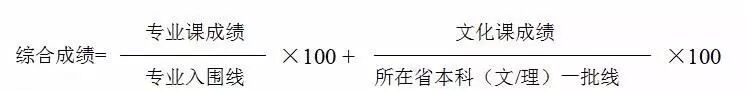 在文化考试成绩总分和我校专业考试成绩总分均达到我校划定的分数线后,按综合分排名,择优录取。综合分计算方法如下: