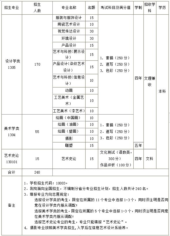 (一)按专业成绩排名录取:造型艺术、中国画、书法学、实验艺术、艺术设计、城市艺术设计专业合格考生,文化课相对成绩达到我校规定的最低分数要求,依据专业成绩排名录取,各专业录取名次由文化课相对成绩达到要求的考生按专业名次由前到后自然排序产生。按专业排名各专业最后名次并列且招生计划不足时,以文化课相对成绩排队录取;