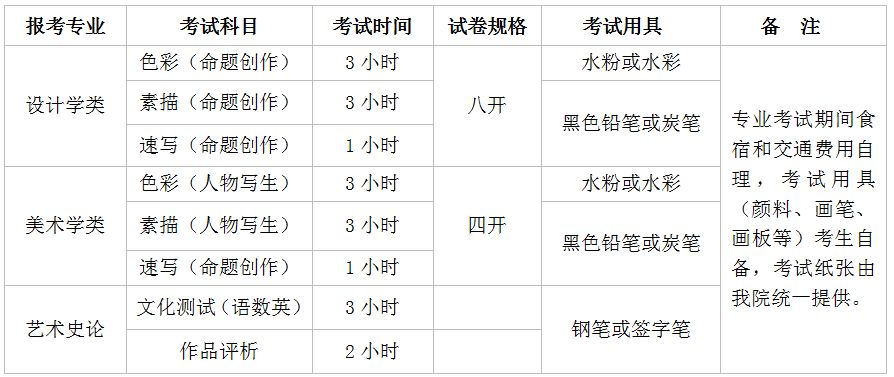 所有考试用纸由我校或考点统一提供,画板(不小于八开纸,不得有任何文字和图案)、颜料、画笔等考试用具全部由考生自备。色彩科目考生可自备直流电(自带电)吹风机。