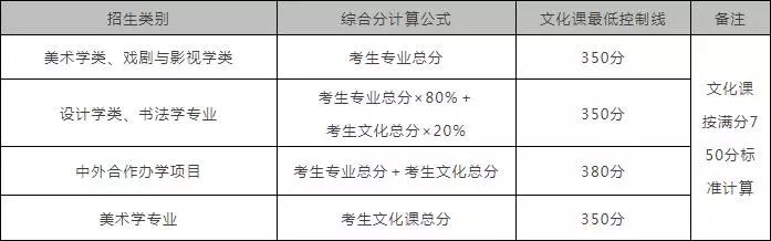 3、报考我院考生(不含报考史论类和中英合作办学的考生),文化总分达到我院规定分数线后,依据考生所填我院专业大类志愿,按照平行志愿录取规则,各大类按综合分从高到低进行排队依次录取,额满为止(天津市考生单独排队择优录取;其他省考生统一排队,择优录取)。综合分计算办法具体为: