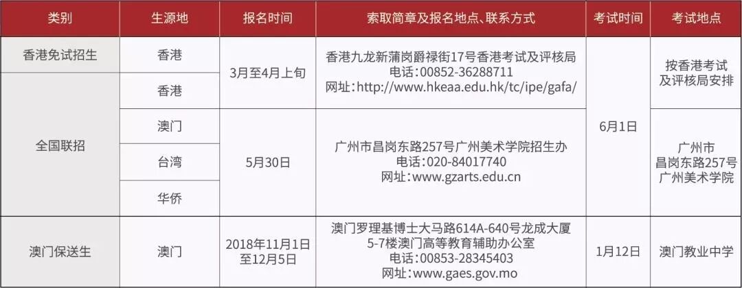 考试科目为《色彩》、《素描》、《速写》,考试大纲详见《广州美术学院2019年中国普通高等学校联合招收澳门保送生简章》。