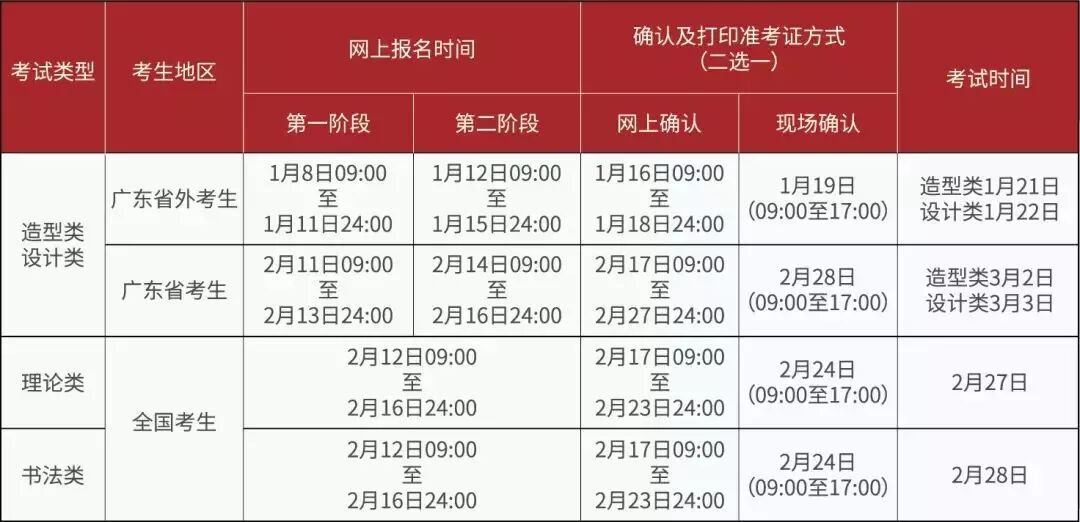 注:因各校外考点容量有限,我校造型类、设计类分两阶段进行网上报名:第一阶段,每个考生仅可选择“造型类”或“设计类”其中之一进行报名;第二阶段,如考点容量未满,考生即可兼报另一种类别。