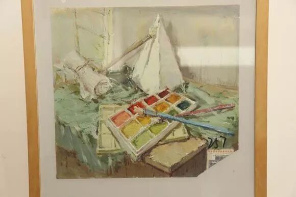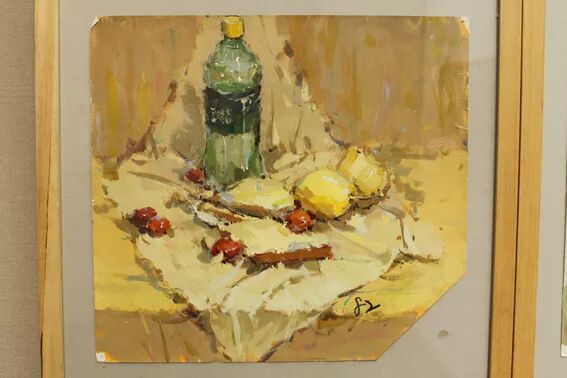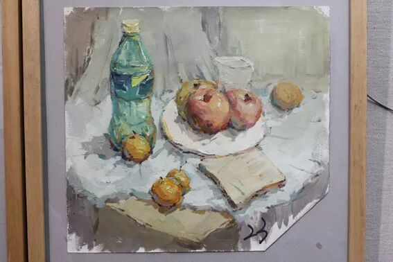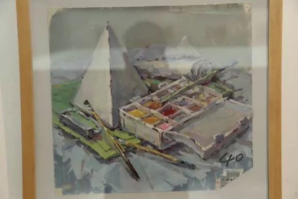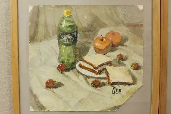 色彩考题:静物组合,卧室一角:抽屉柜一个,背包一个,宠物狗一只,运动鞋一双