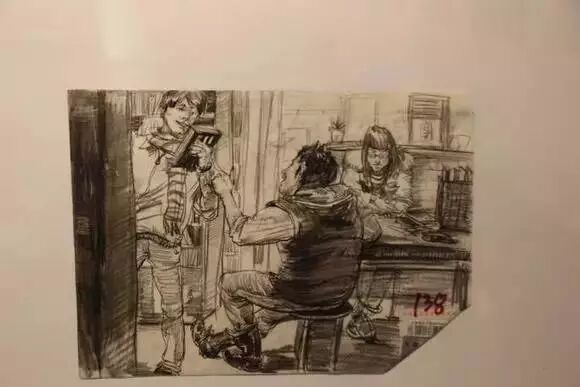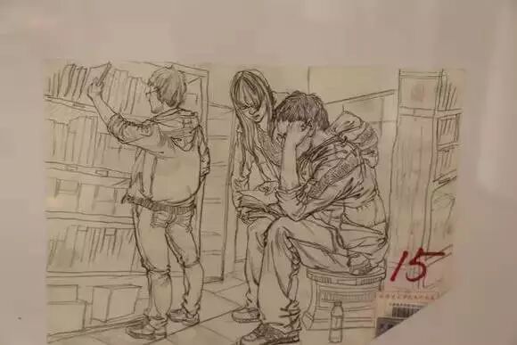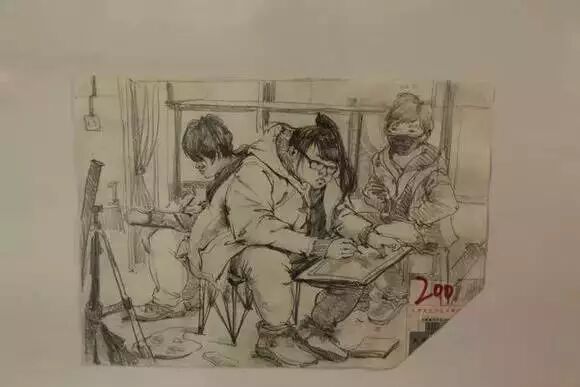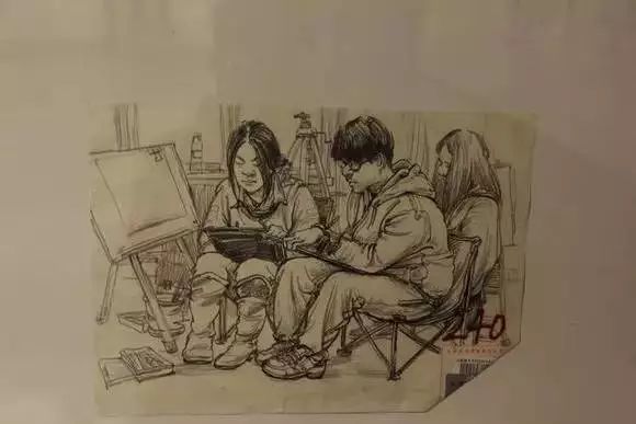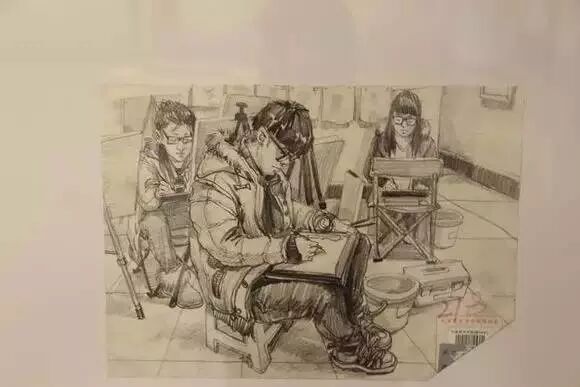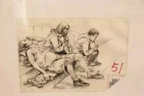 速写考题:场景默写,火车站候车厅一对情侣在自拍,时间30分钟