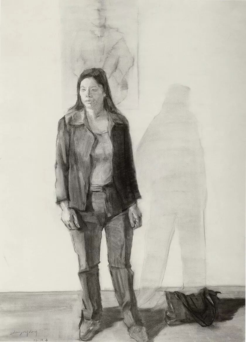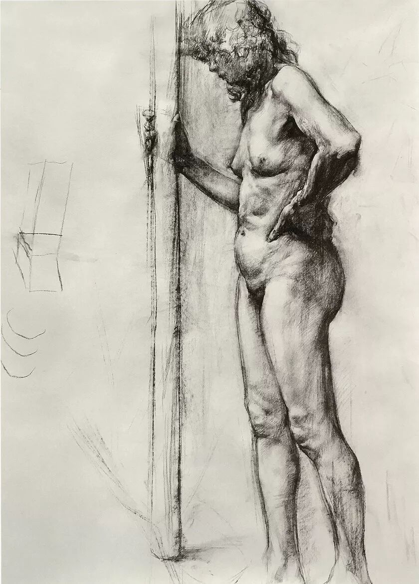 整体观察一定是配合绘画步骤的。如果是全身像写生,我们开始绘画对象前要仔细观察对象,多注意对象头、胸腔、臀和四肢所形成的动态和相互之间的比例关系以及形的基本特征而不是细微特征。在局部刻画和深入刻画时一定要经常退远看,只有不断地关注画面的全貌,才能协调好所有局部的相互关系。