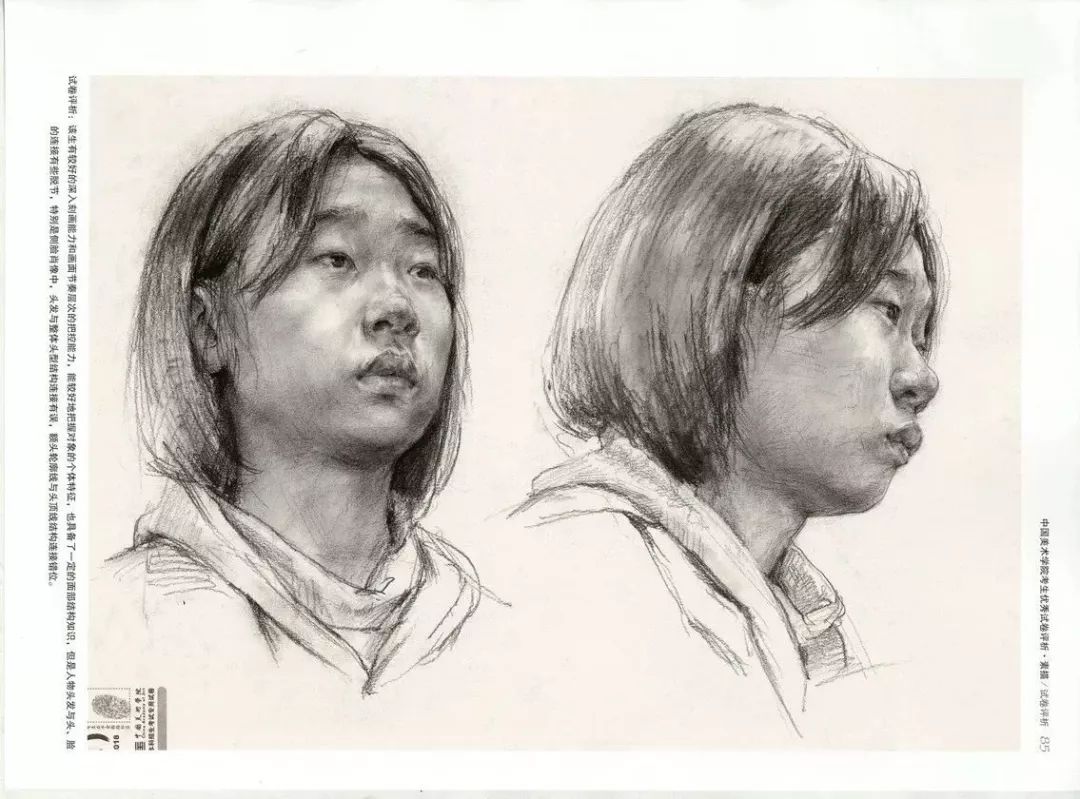 试卷评析:该生有较好的深入刻画能力和画面节奏层次的把控能力,能较好地把握对象的个体特征,也具备了一定的面部结构知识,但是人物头发与头、脸的连接有些脱节,特别是侧脸肖像中,头发与整体头型结构连接有误,额头轮廓线与头顶线结构连接错位。