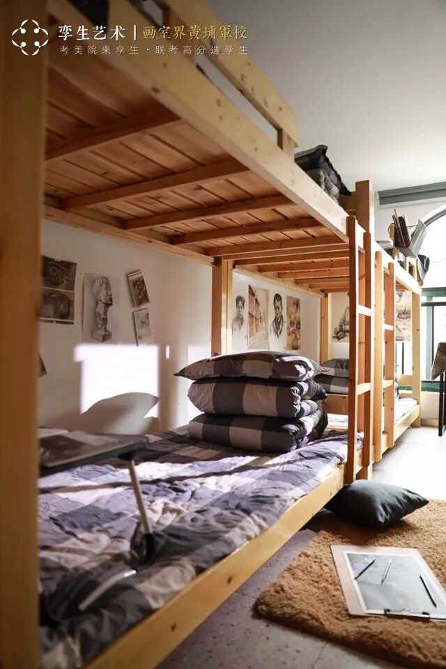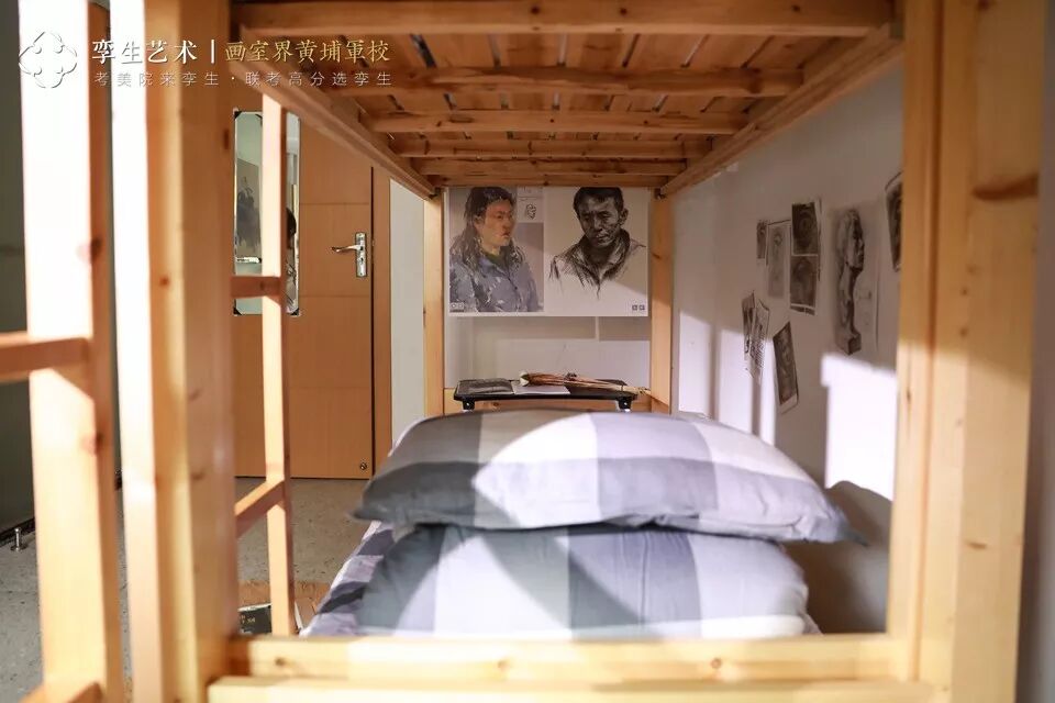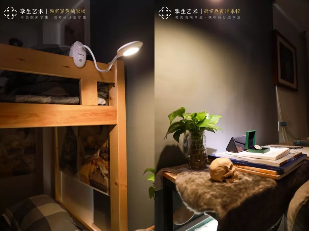 小床上的白色台灯应该是学姐们深夜回来画速写作业,为了不打扰室友的休息而特地放了盏小台灯。