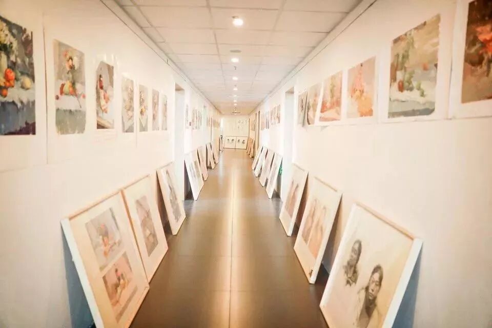 进入教学区域,过道两侧挂满了优秀师生绘画作品,随时可以观摩学习并提高,营造着良好的学习氛围。