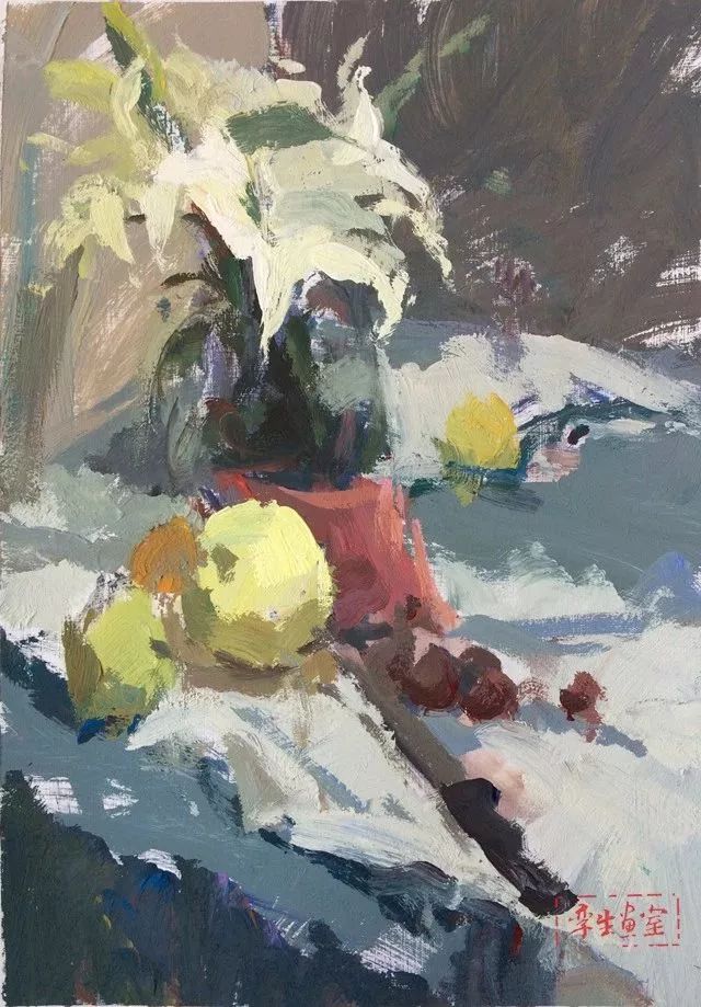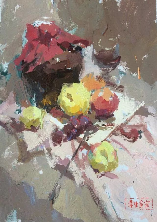 我们首先感受一下要画的物体,哪种色彩占的比例大,色彩倾向与主要静物的色彩是协调的还是对比关系。如果色彩属同类色系的范围,那么它们就基本决定了这组静物的色调倾向,占据画面主要位置大面积的颜色就构成了该画面的主要色调。